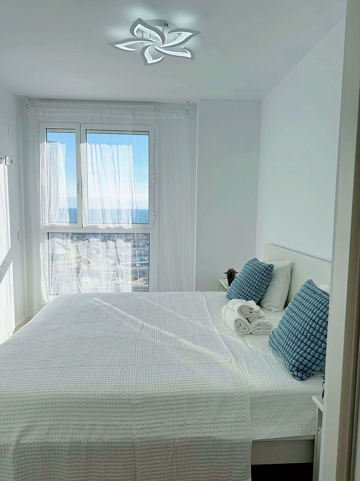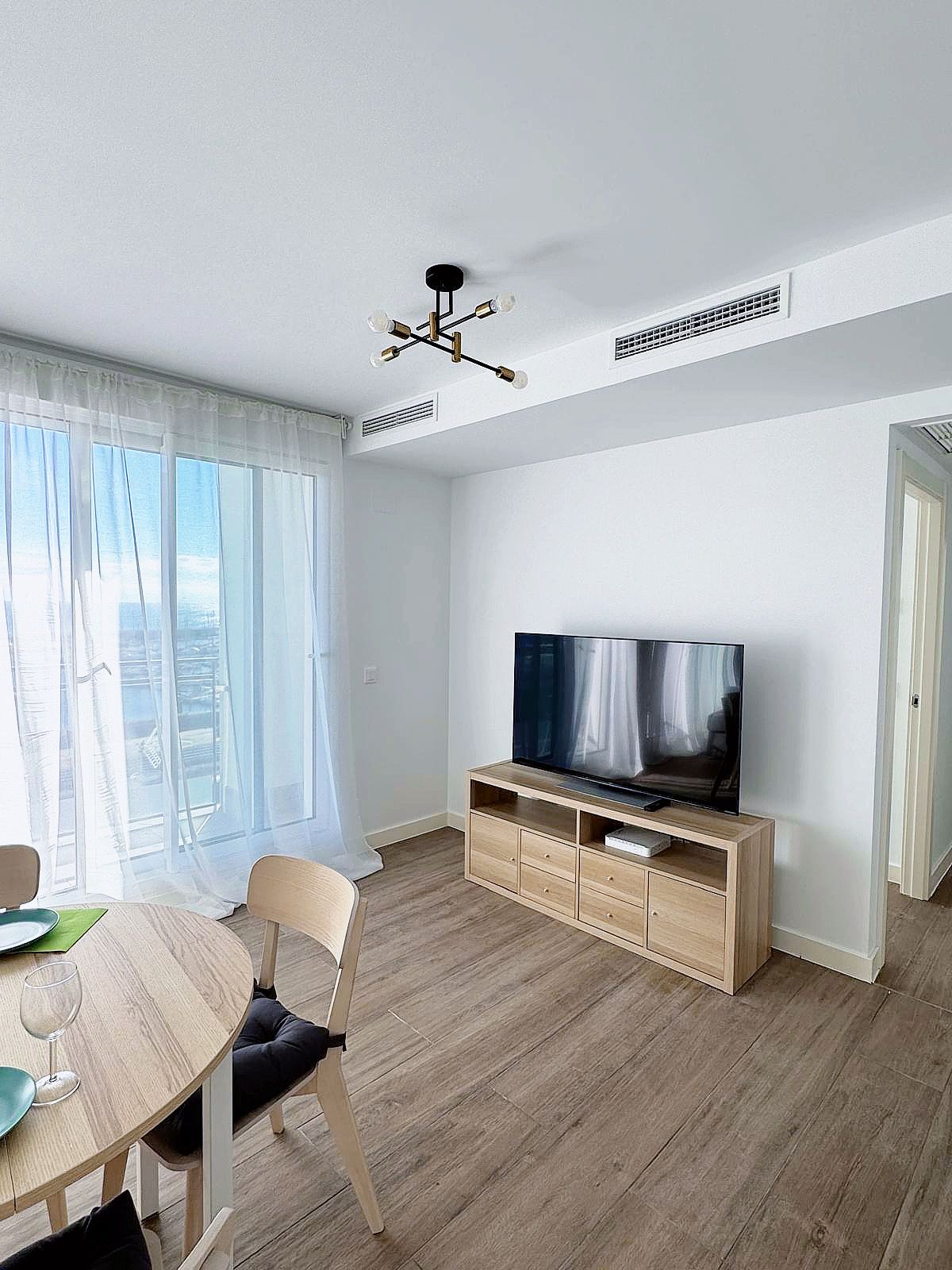 Cuenta con un dormitorio cómodo, una zona adicional para dormir, dos baños, una cocina moderna totalmente equipada y un amplio salón-comedor con sofá, TV y balcón.